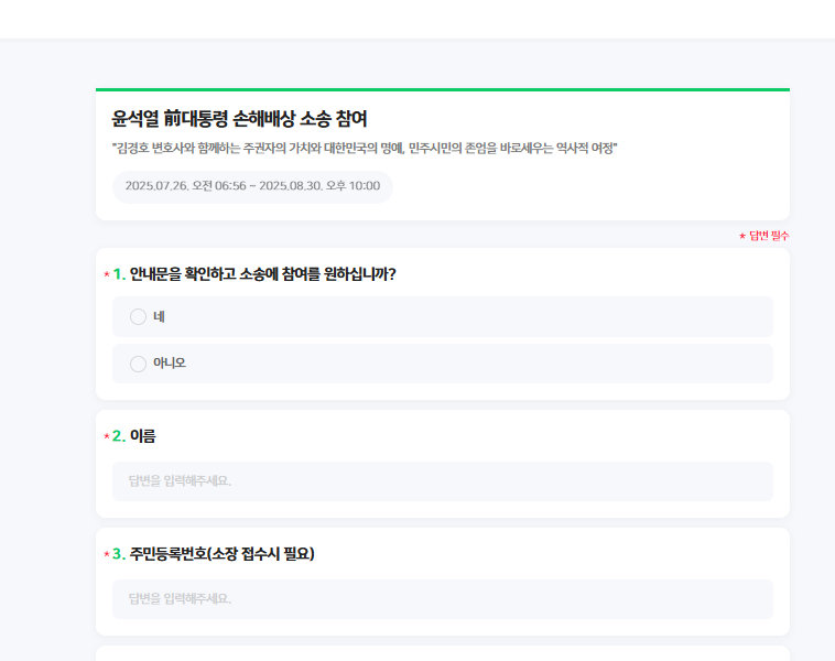 비상계엄 피해보상금 소송 신청 링크 안내입니다. 네이버폼으로 누구나 참여할 수 있다고 하는데요. 아래 참고하여 오픈채팅방까지 알아보시길 바랍니다.