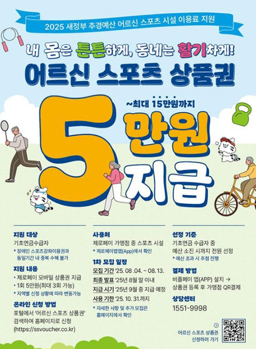 어르신 스포츠 상품권 15만원 신청하기 안내입니다. 문화체육관광부와 보건복지부가 공동으로 시행하는 고령층 체육 복지 정책입니다. 신체 활동이 줄어드는 노년기에, 어르신들이 운동과 여가를 보다 쉽게 즐길 수 있도록 스포츠 시설 이용료를 지원해주는 제도예요.